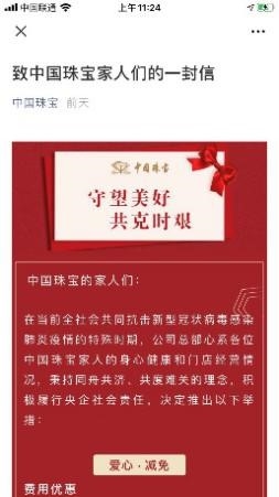 (中国珠宝发布《致中国珠宝家人们的一封信》宣布优惠政策)